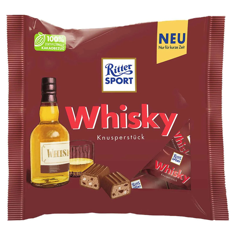 Drink z Whisky to już przeszłość – teraz czas na słodką rewolucję z Ritter Sport Whisky. W tej niecodziennej czekoladce rodzynki nasączone prawdziwą whisky łączą się z kremem z orzechów laskowych, kawałkami chrupiącego wafelka i ryżowymi chrupkami, tworząc wyjątkowe połączenie smaków.