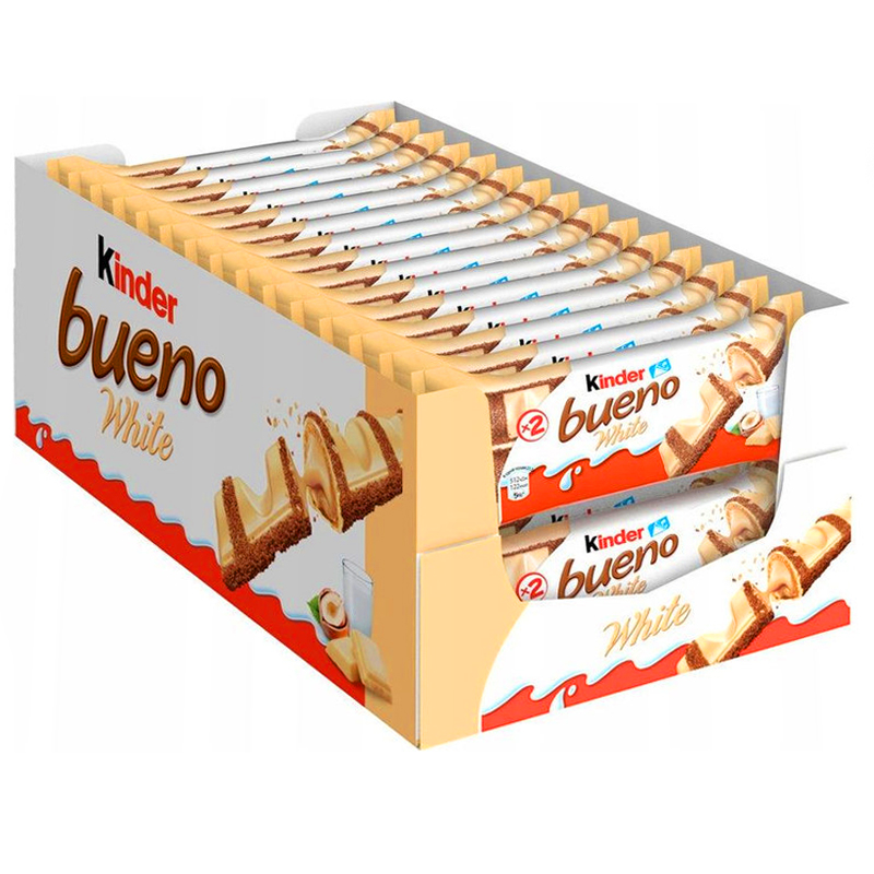 Kinder Bueno White to delikatnie chrupiący wafelek w białej czekoladzie z jedwabiście kremowym nadzieniem orzechowym. Połączenie lekkiej, kruchej struktury z aksamitnym kremem i subtelnie mleczną polewą daje deser, po który sięga się z przyjemnością.