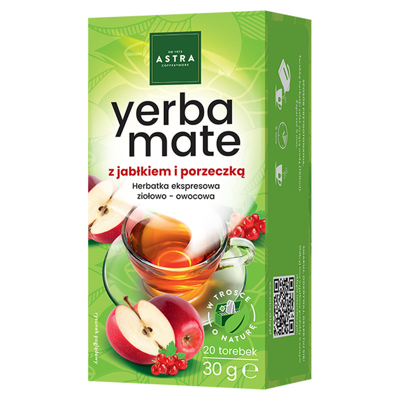 Astra Yerba Mate z porzeczką i jabłkiem to ziołowo-owocowa herbatka ekspresowa. Łączy energetyzującą yerba mate z lekko kwaśną porzeczką i słodyczą jabłka, dając delikatne pobudzenie i owocowy aromat. Sprawdzi się na poranek i popołudniowe odświeżenie, w domu, pracy i w podróży.
