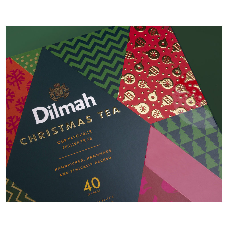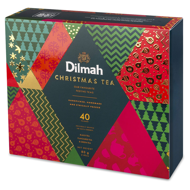 Dilmah Happy Christmas Gift Pack 40 x 2 g to świąteczny zestaw herbat w kopertowanych torebkach: klasyczne czarne, czarne aromatyzowane oraz zielona. Sprawdza się jako upominek i do codziennego parzenia w zimowym sezonie.